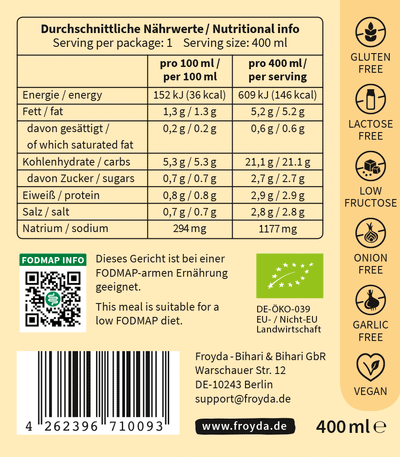 Our dishes are low-fructose, naturally lactose-free and gluten-free, as well as low-FODMAP. So you can enjoy an easy to digest, healthy and delicious meal anytime in just a few minutes.